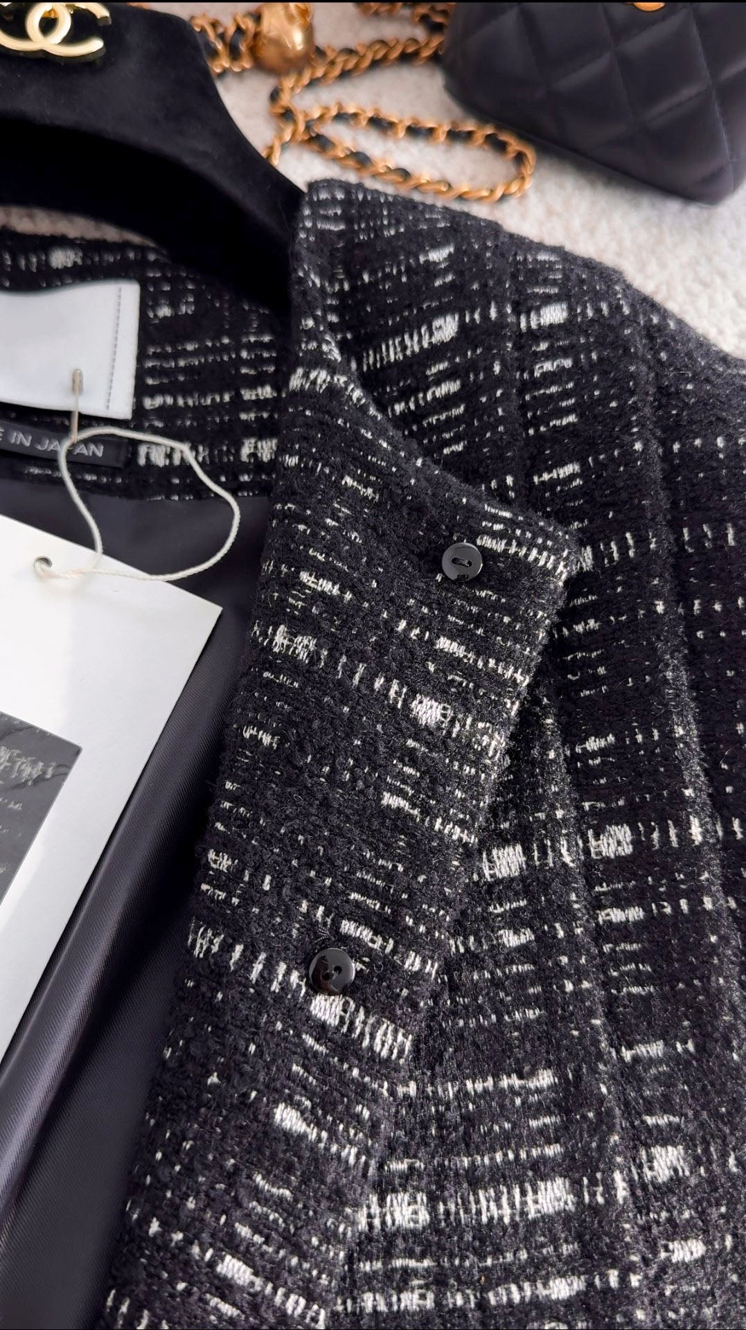 A timeless tweed vest crafted from a luxurious wool-blend Japanese fabric, showcasing Laube’s dedication to fine craftsmanship and elevated design. The subtle metallic thread woven through the black and ivory pattern gives the piece a refined luster, while the structured silhouette creates an effortlessly elegant shape.