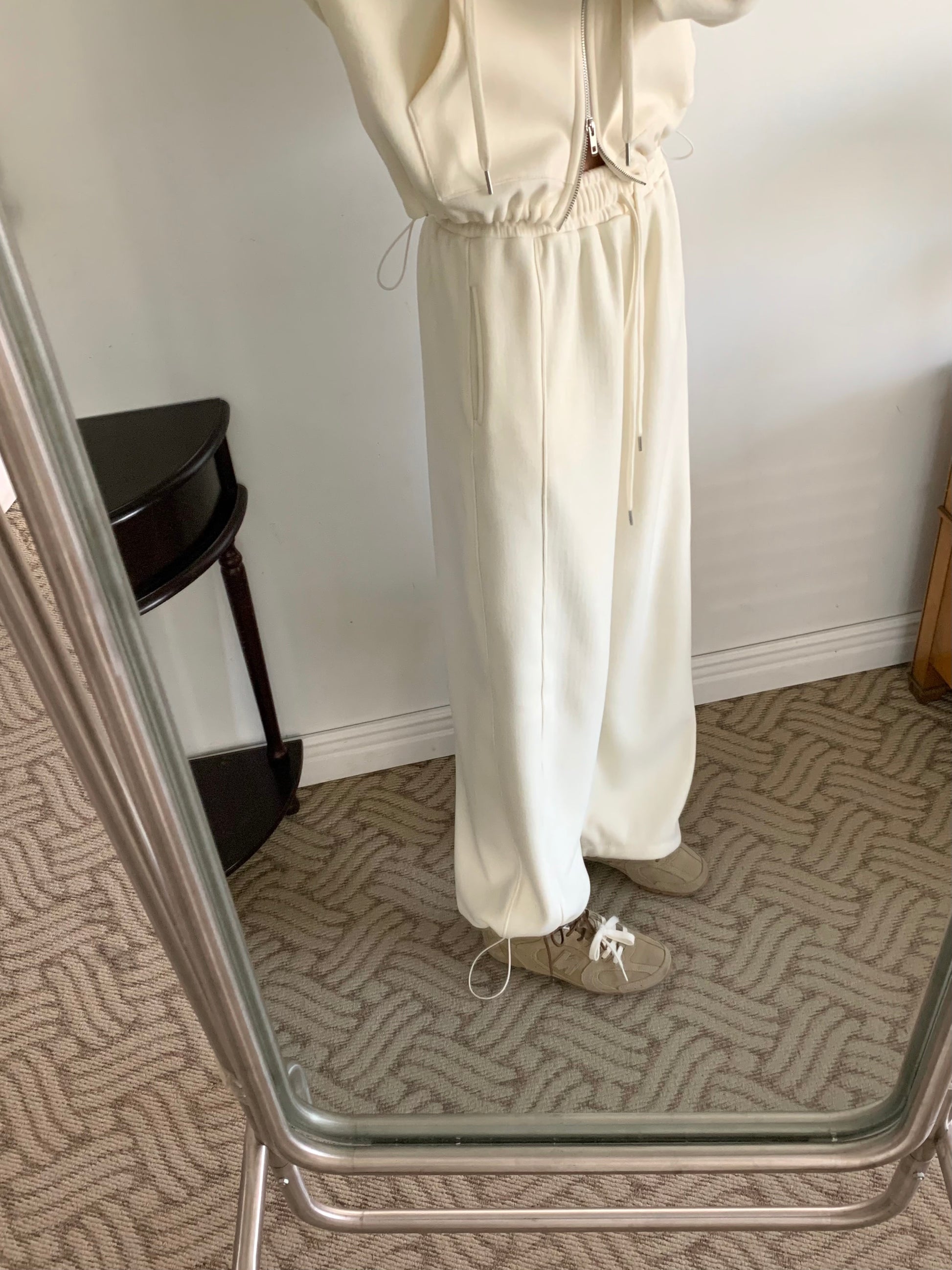 These lounge pants feature a relaxed wide-leg silhouette that drapes beautifully while keeping you warm and cozy. The inside is fully lined with plush fleece, giving a soft, gentle feel against the skin — perfect for colder days and everyday comfort.