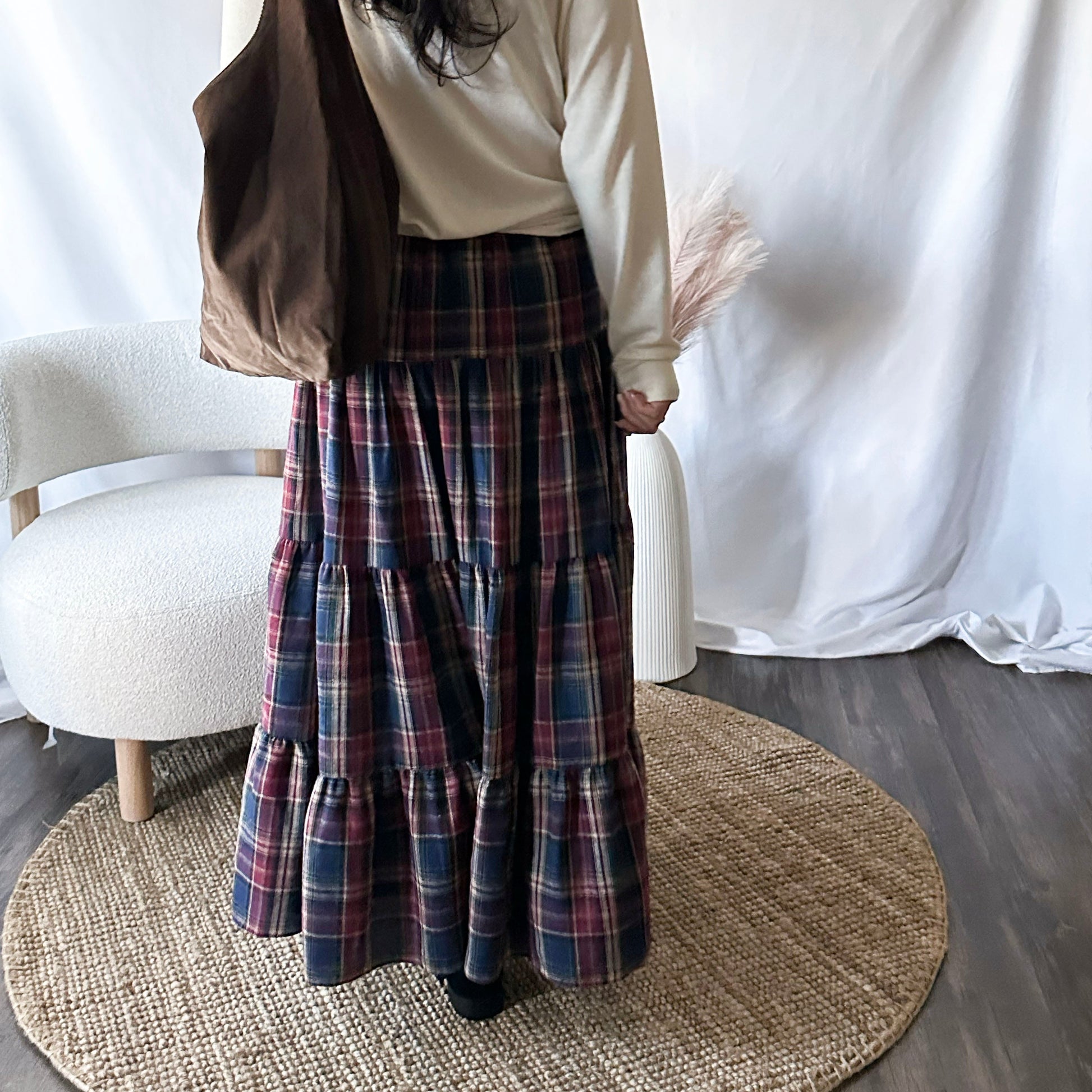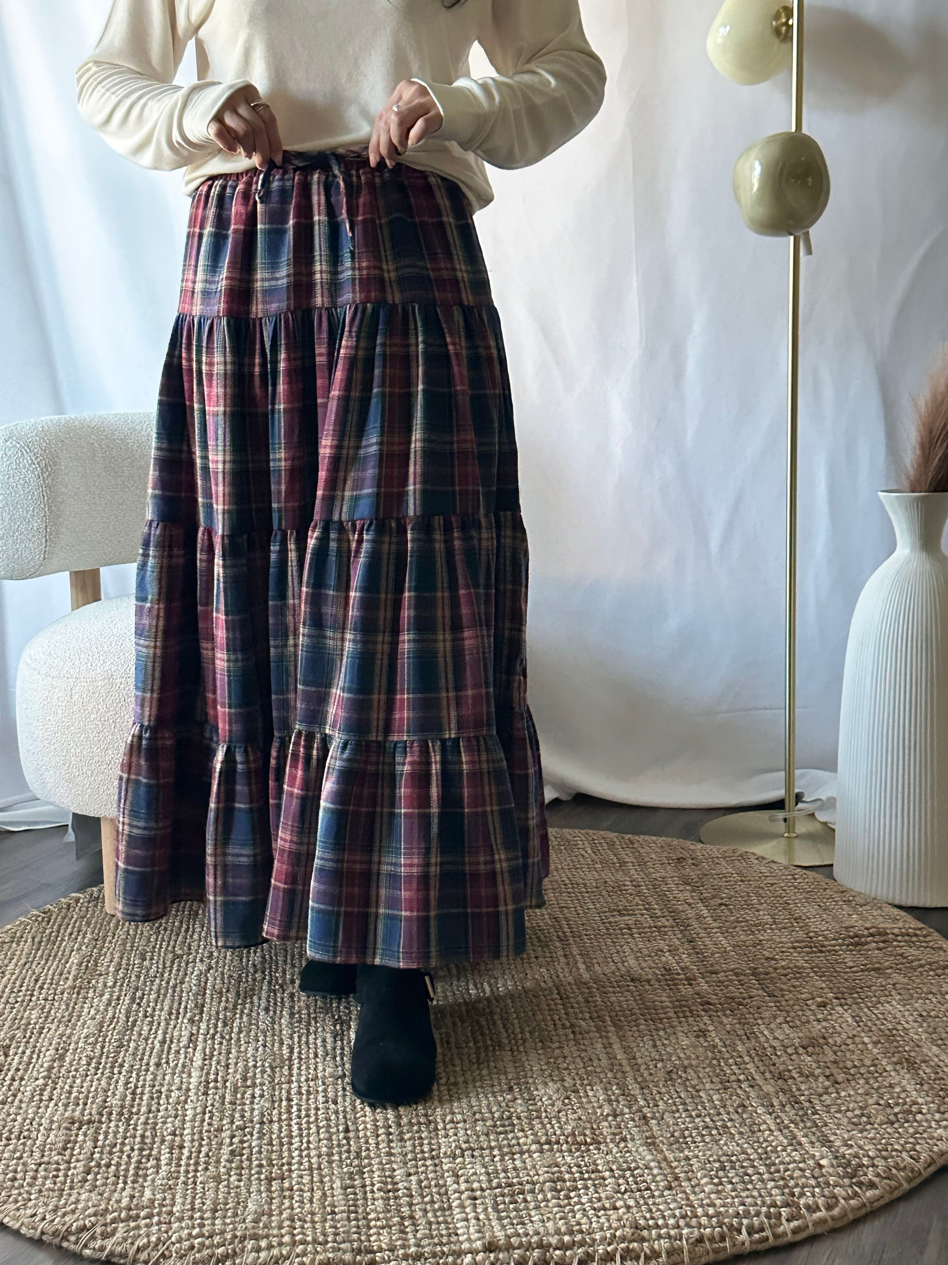 A refined take on timeless plaid. This tiered maxi skirt drapes effortlessly with soft gathers and fluid volume. The elasticated waistband with a drawstring ensures comfort without compromising elegance. Subtle yet distinctive, it pairs beautifully with elevated knits or structured outerwear for a modern, understated look.