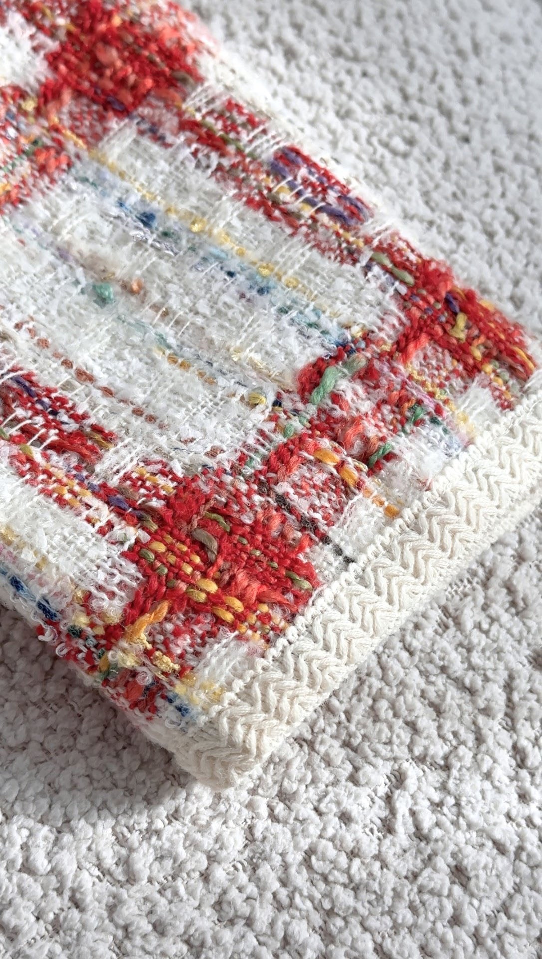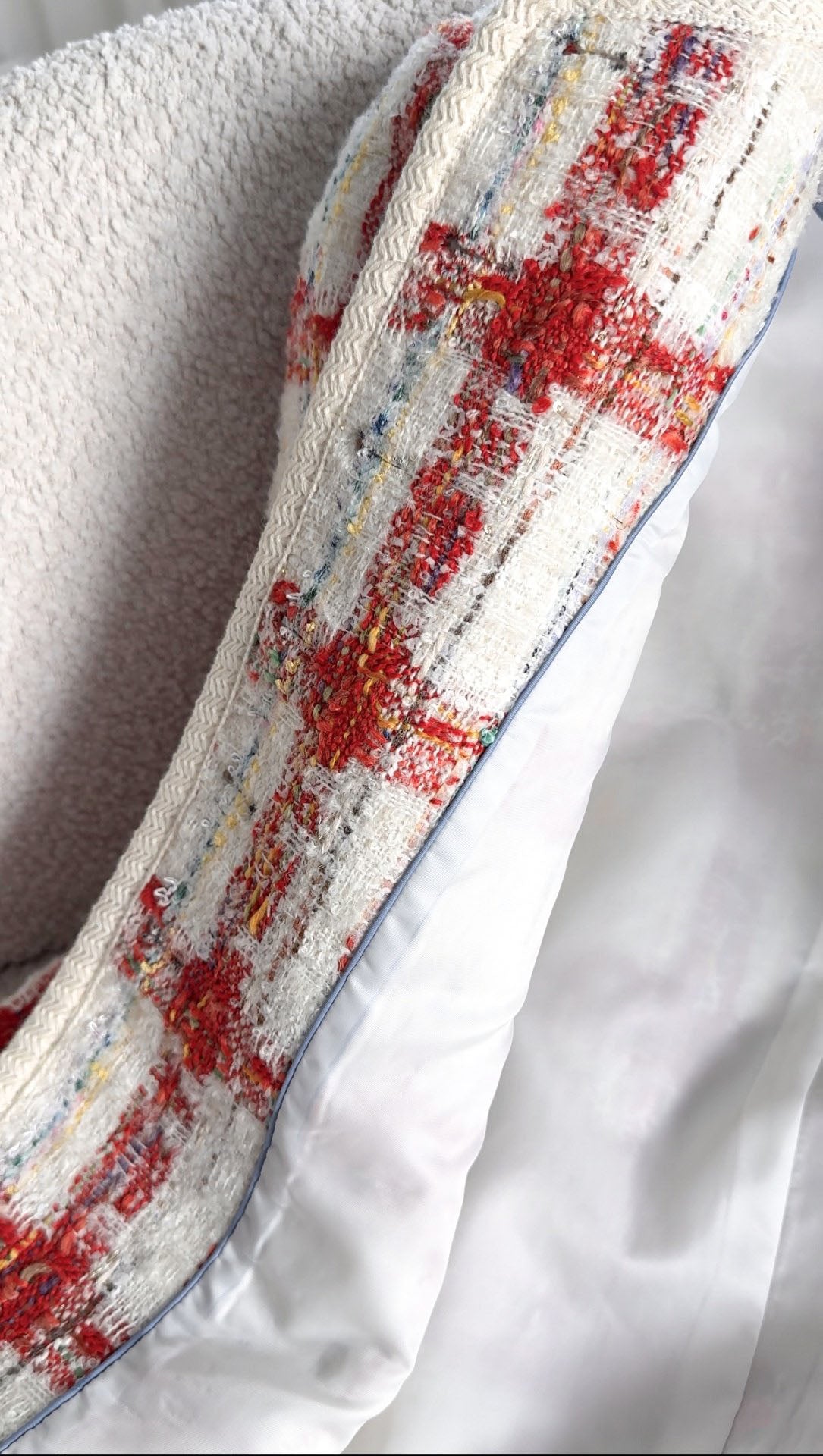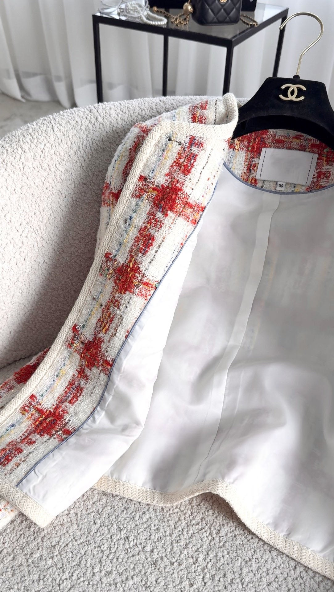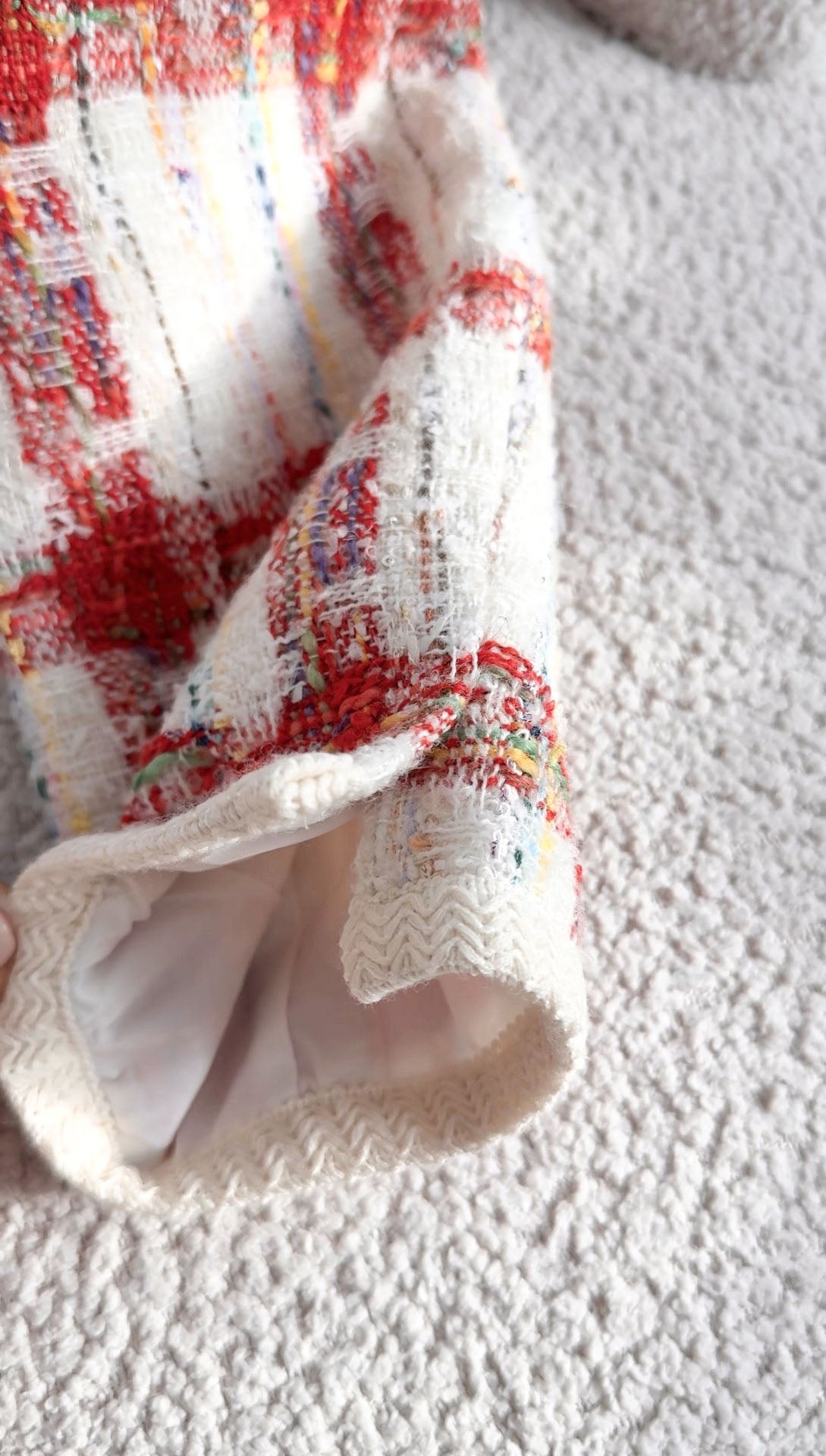 Crafted from a premium textured tweed fabric, this piece features a soft ivory base interwoven with warm red and subtle multicolor threads, creating a beautifully balanced check pattern.