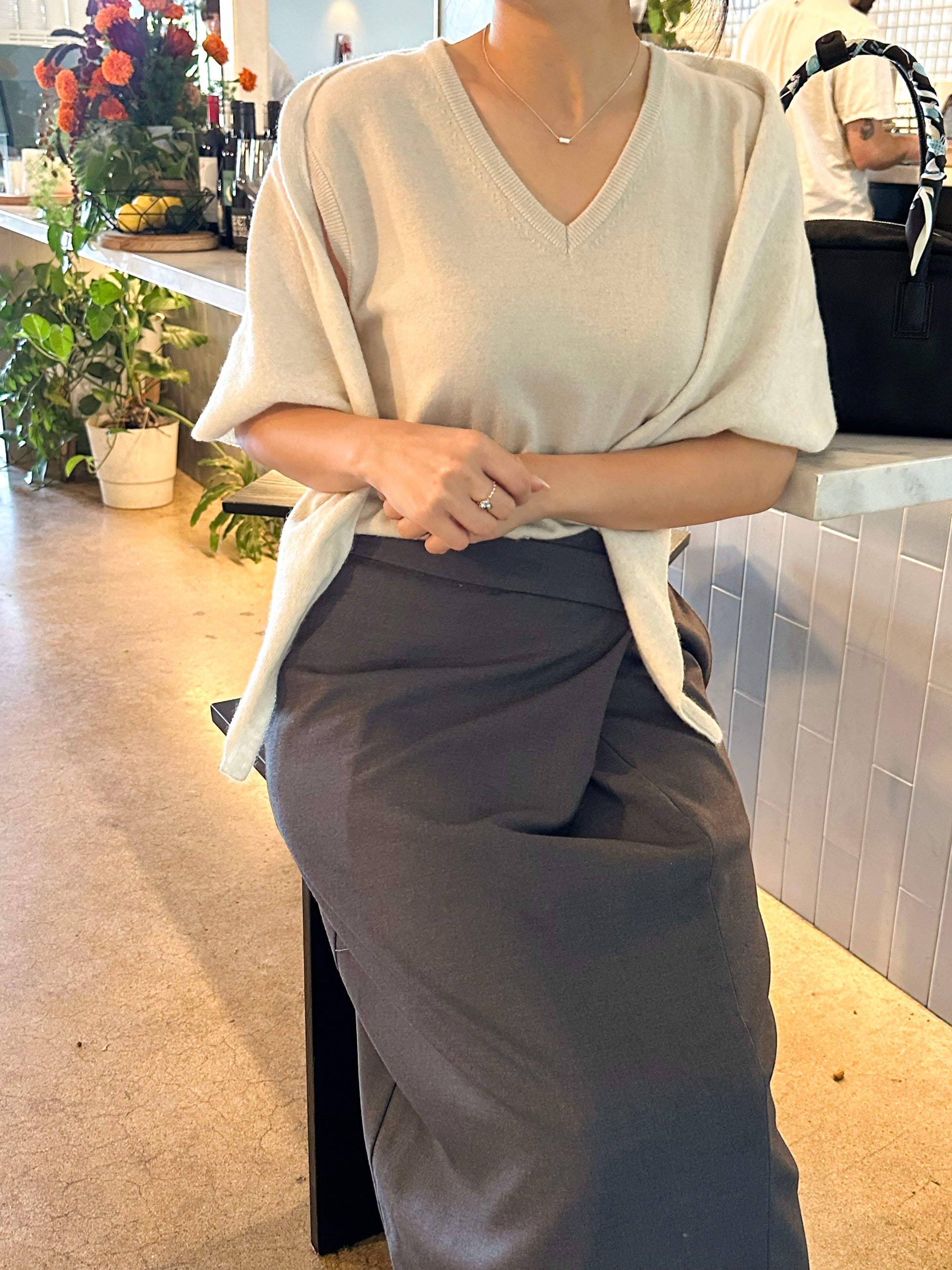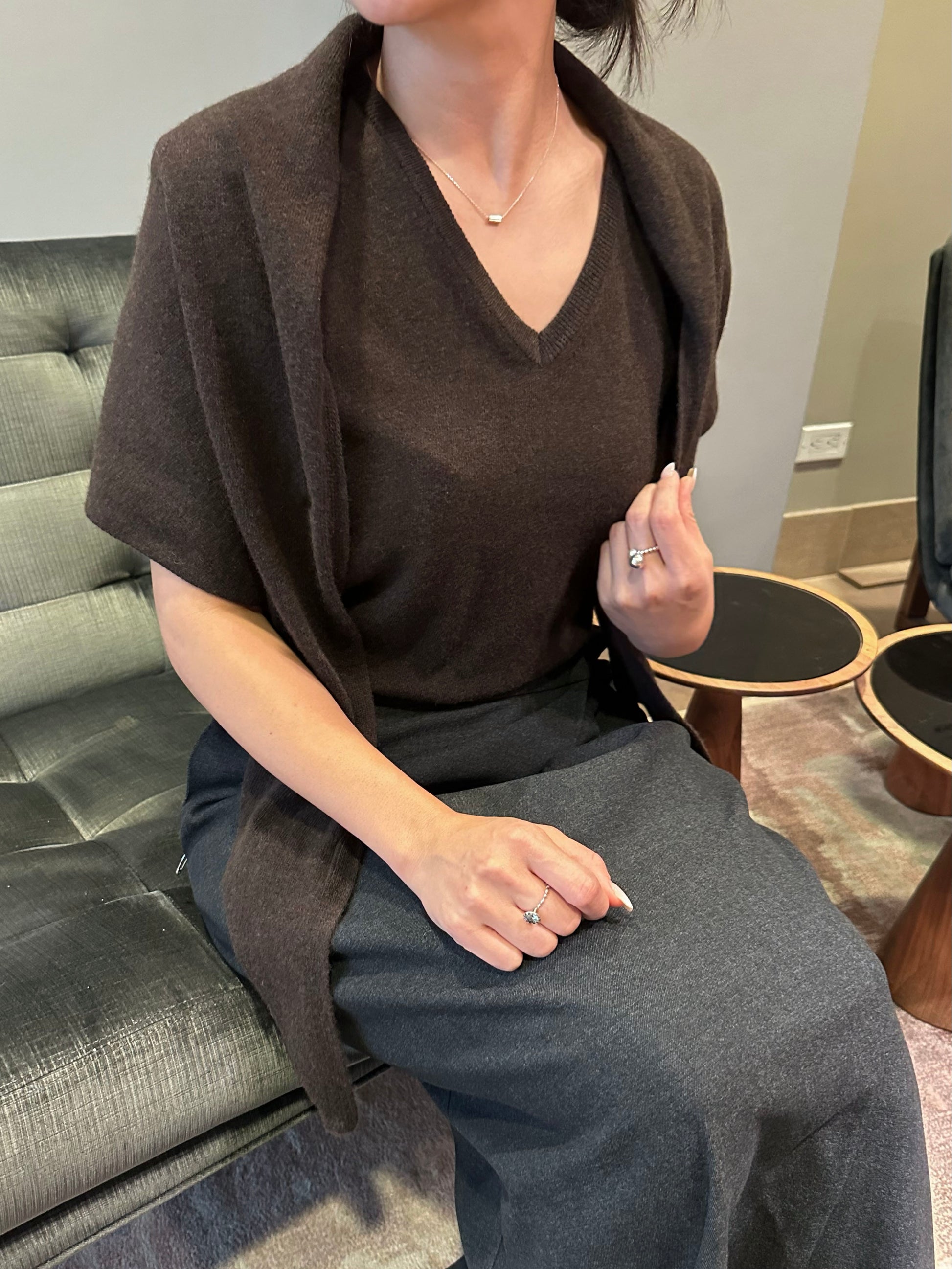 A versatile wool shawl designed in a modern triangular cut for effortless draping. Crafted from soft, premium wool, it can be styled as a matching set with our knit vest or layered over outerwear for added warmth and elegance. Lightweight yet cozy, this piece transitions seamlessly from casual looks to sophisticated layering. Available in a range of refined colors to complement any wardrobe.