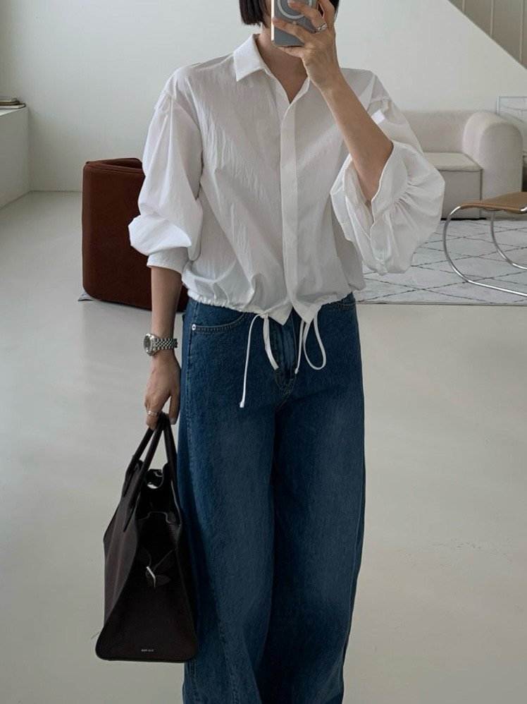 A relaxed yet refined shirt featuring soft puff sleeves and an adjustable drawstring hem.