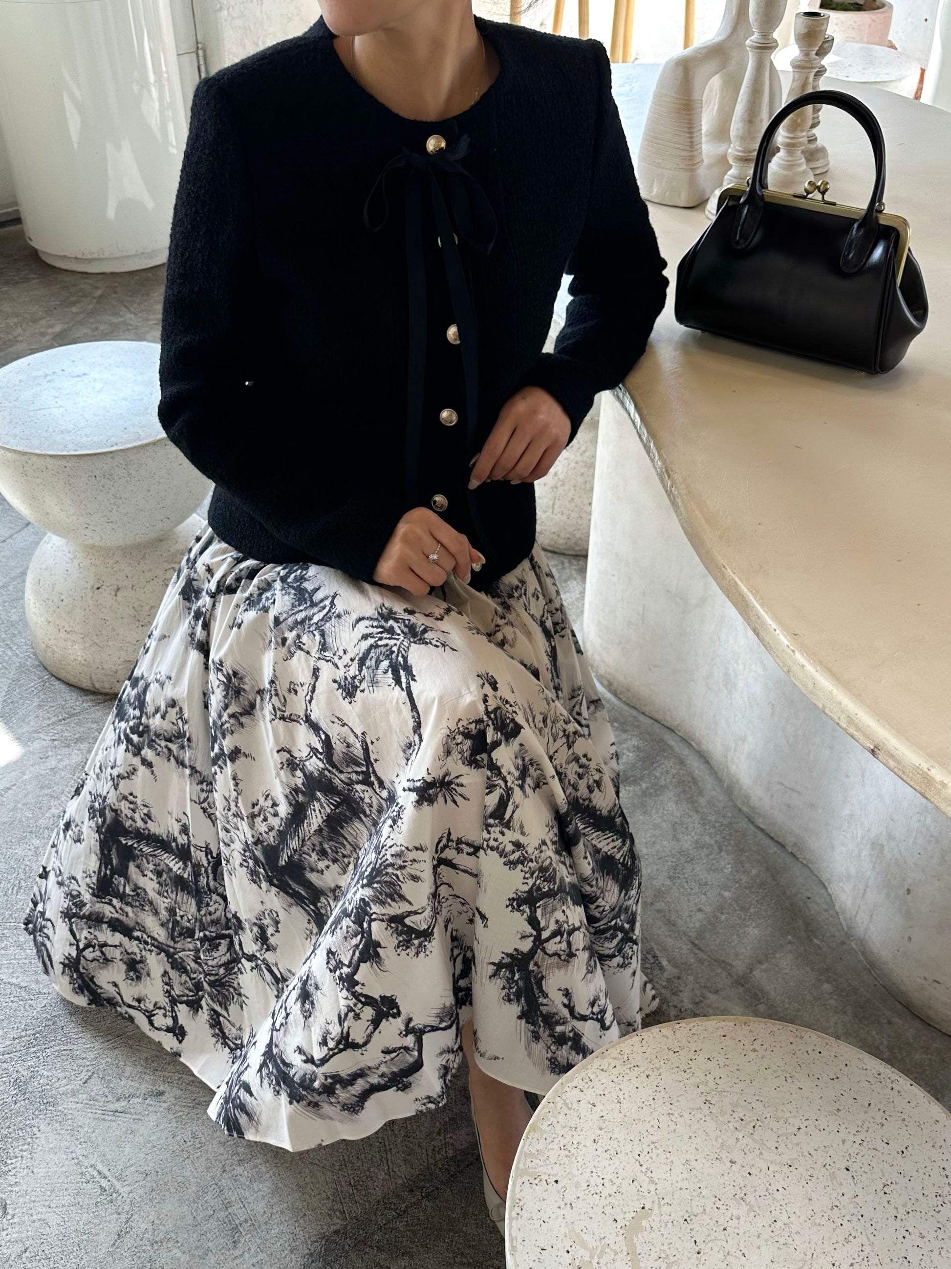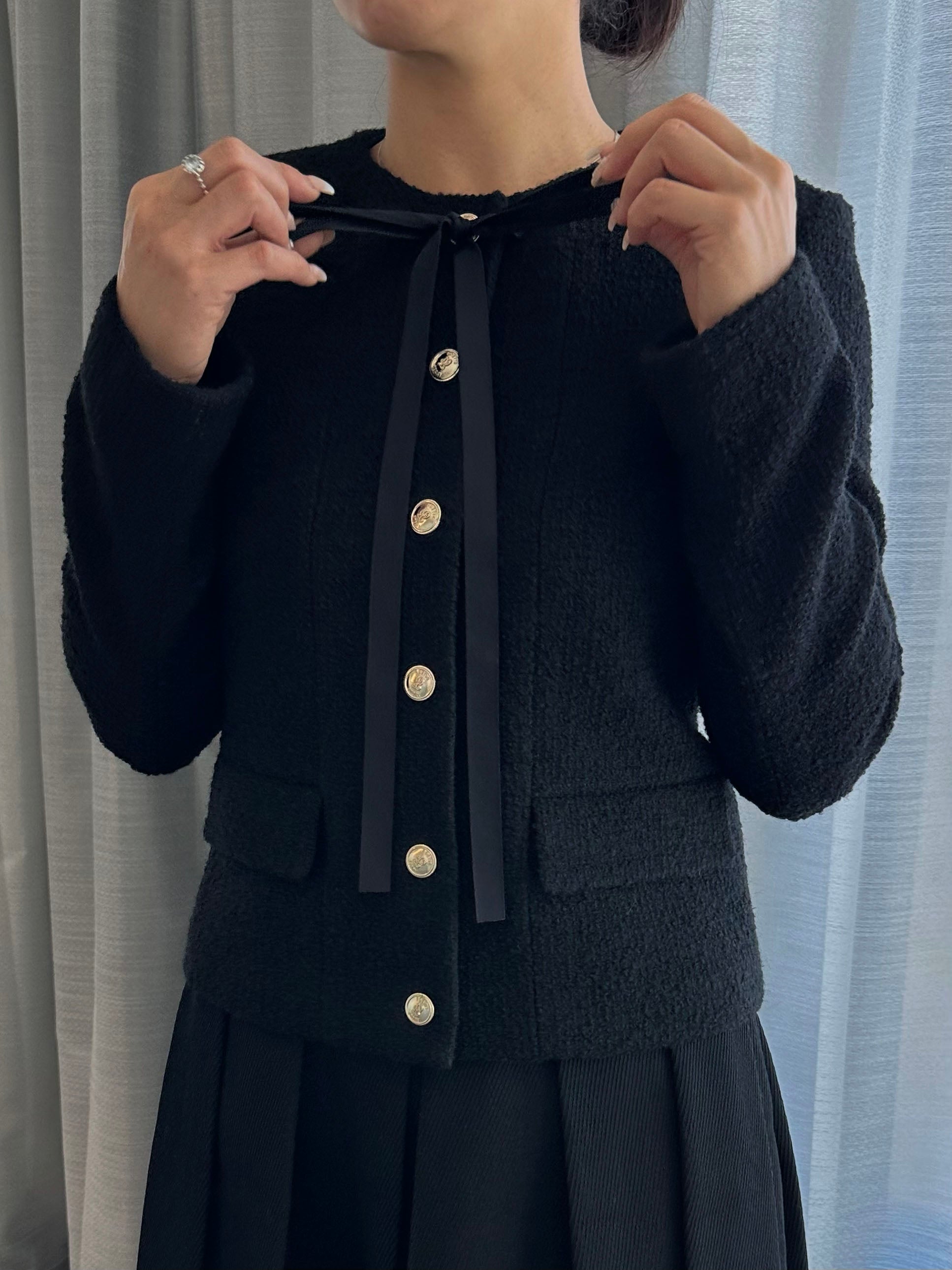 Crafted from a premium textured fabric with a rich, structured hand feel, this jacket maintains its elegant shape while feeling luxuriously soft. The satin ribbon tie and gold-tone buttons add a subtle touch of sophistication, making it perfect for both daytime polish and evening refinement.