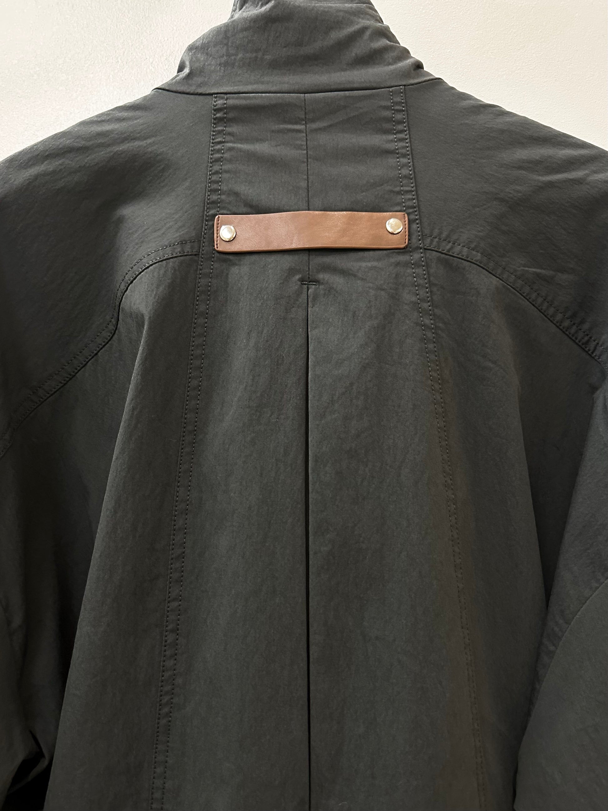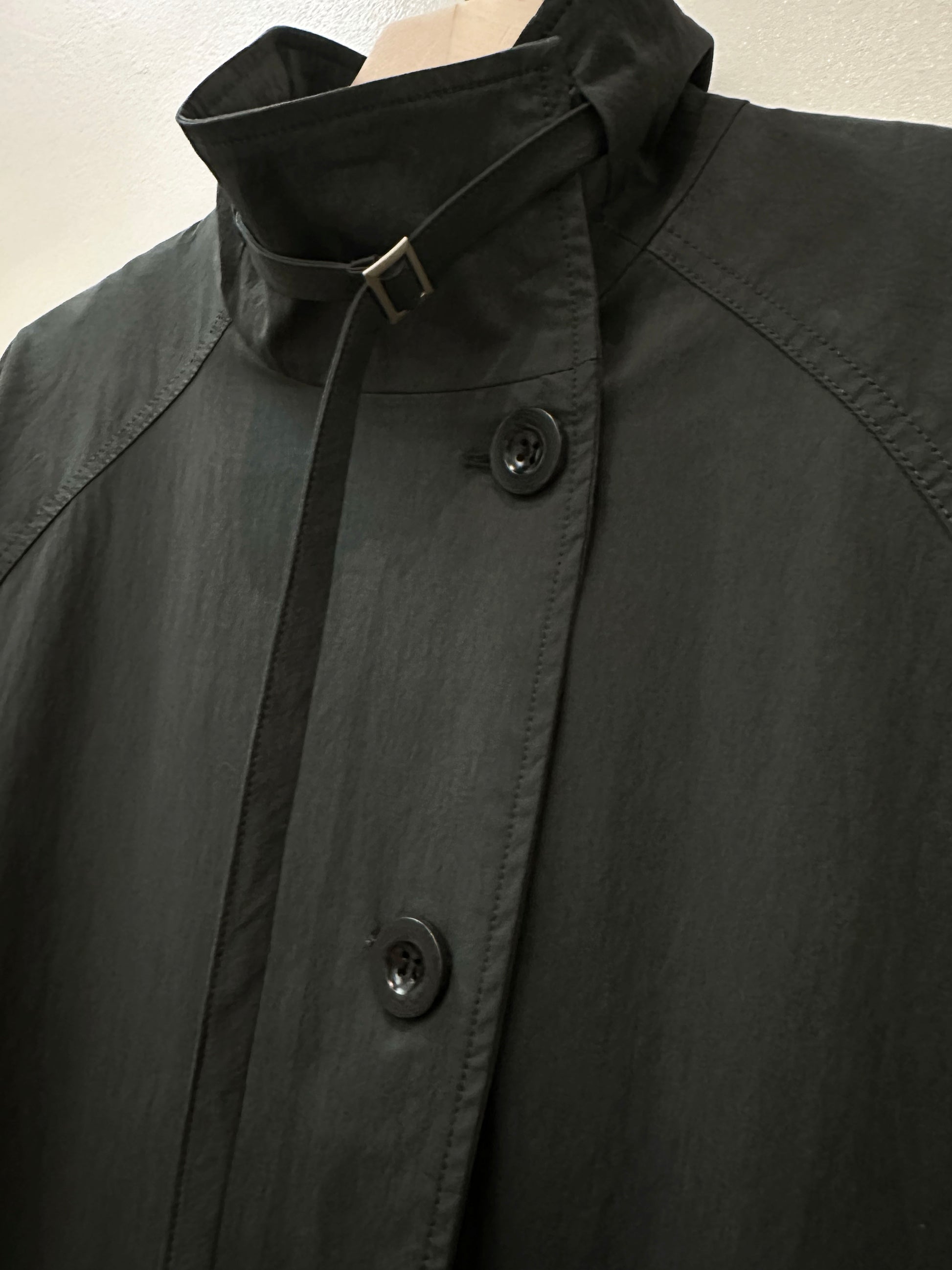 A refined modern trench coat featuring a minimal silhouette and structured stand collar design. Crafted from crisp, lightweight cotton-blend fabric, it drapes effortlessly while maintaining a clean, architectural shape. The asymmetrical front buttons and subtle neck strap detail add a contemporary edge to the timeless trench look.